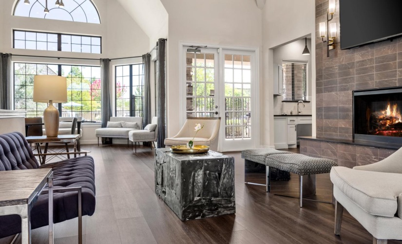 a kitchen with white cabinets a building with a large front door a living room with a couch and a coffee table clubhouse lobby area with couch and several tables with lamps private conference rooms with glass surround and doors